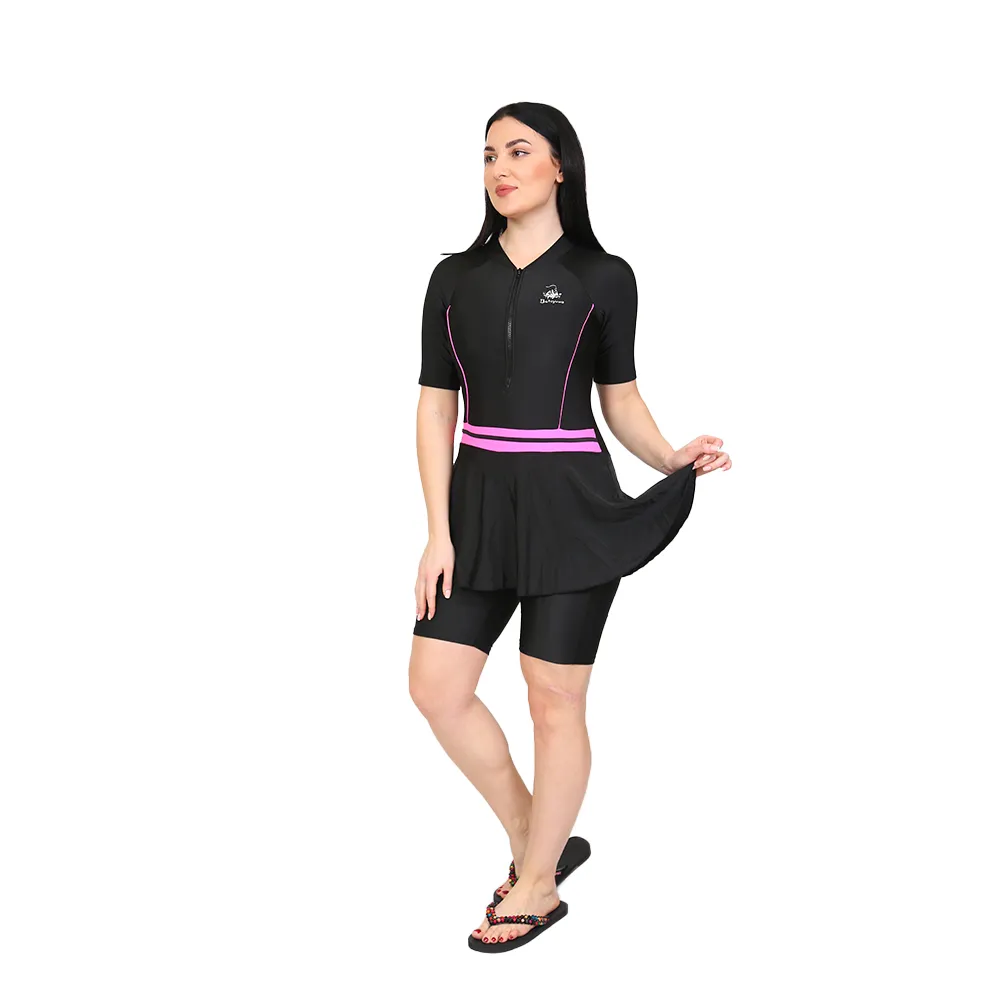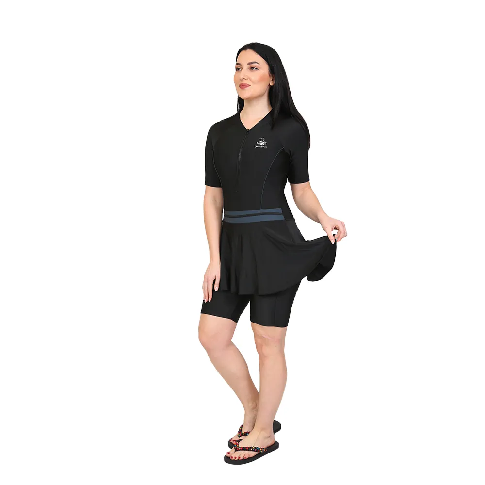 T2903-3 LILY skirtted swimwear is a one piece clothing that is suitable for swimming, it comes with front zipper and it is made out of the finest fabric that makes it easy to wear and easy to move in. The swimsuit comes with a long short above the knees under the skirt.