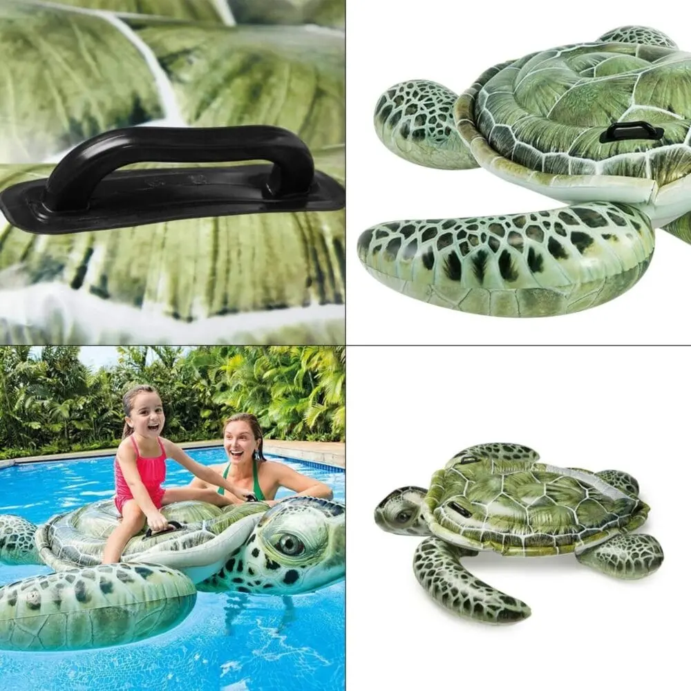 Enjoy pool fun with the Intex Sea Turtle Ride-On, a realistic, green inflatable featuring sturdy handles, easy inflation, and spacious design for safe and entertaining water adventures.